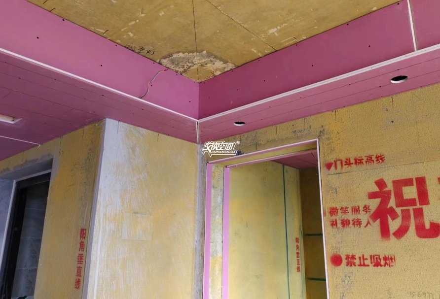 ▲石膏板吊顶转角处采用七字整板转角,转角处大于50公分,八字缝合格。