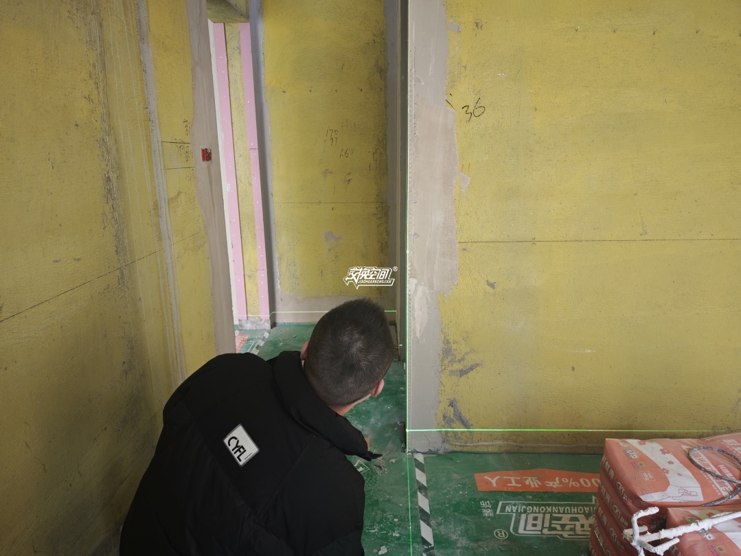 ▲用激光水平仪检查墙体阴角垂直度,如果激光线和角重合,则说明阴阳角垂直度没有问题;如果不重合,说明阴阳角不垂直。
