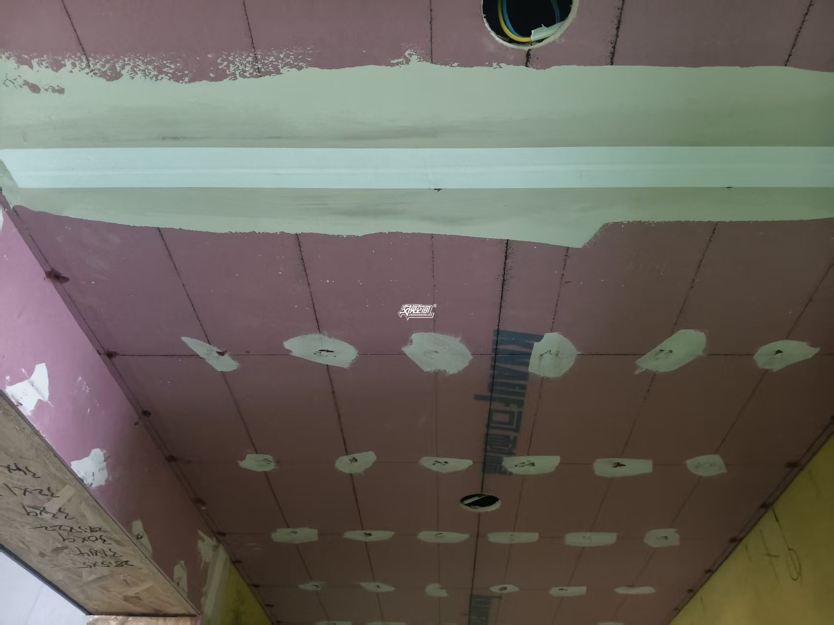▲乳胶漆基层处理,所有钉眼防锈处理,石膏板石膏找平并填缝,接缝处贴牛皮纸或挂网格布防开裂处理。