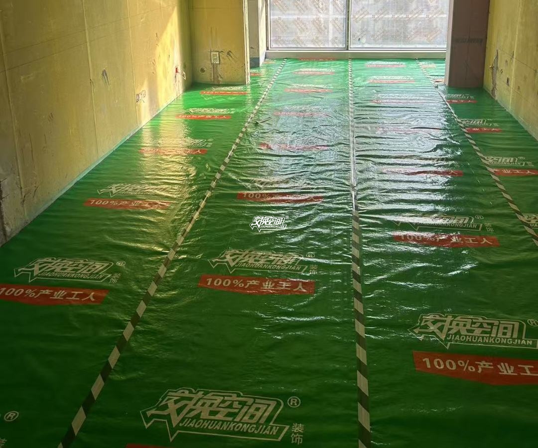▲地砖铺设完成后进行成品地膜保护,确保地面后期无污染,不易划伤。