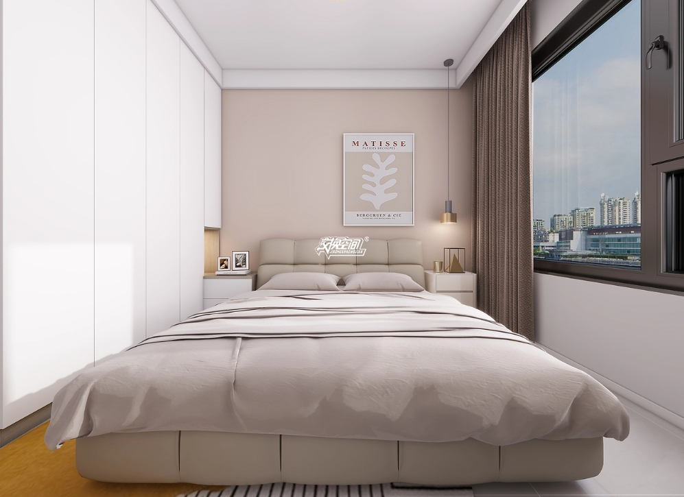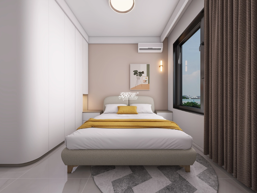 卧室色调以柔和的浅色为主,营造出一种宁静、舒适的氛围。衣柜的设计简洁,无把手,整体感强,提供了充足的收纳空间。