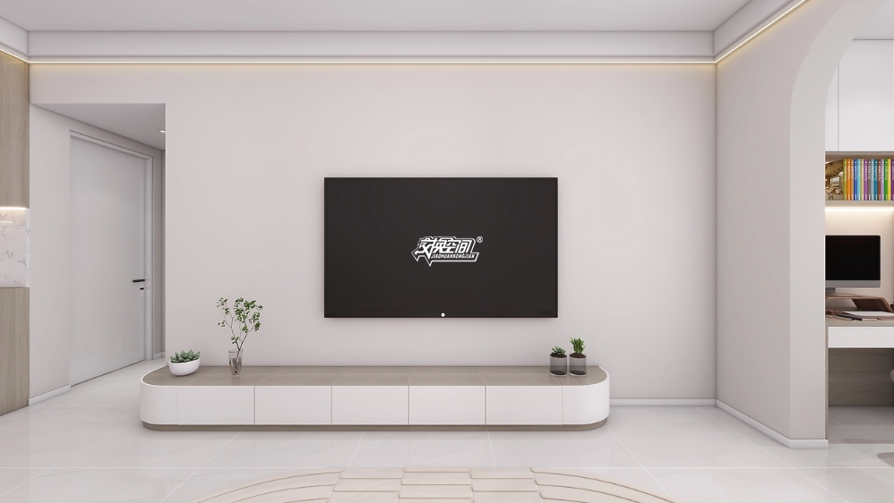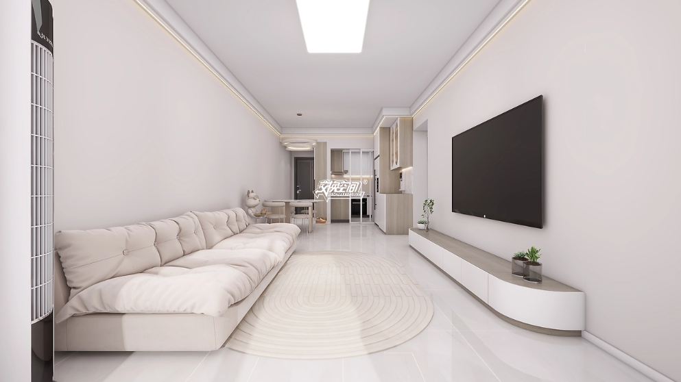 整个空间以白色和浅米色为主色调,营造出明亮、干净且温馨的氛围。浅木色的家具和装饰则为空间增添了一些自然的质感。