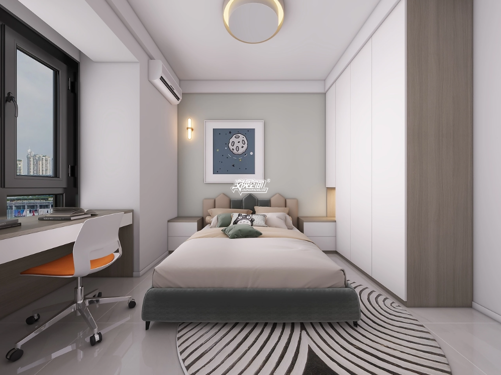 儿童房设计通过简洁的布局、清新的色彩和合理的照明设计,营造出一个舒适、明亮且充满童趣的空间。