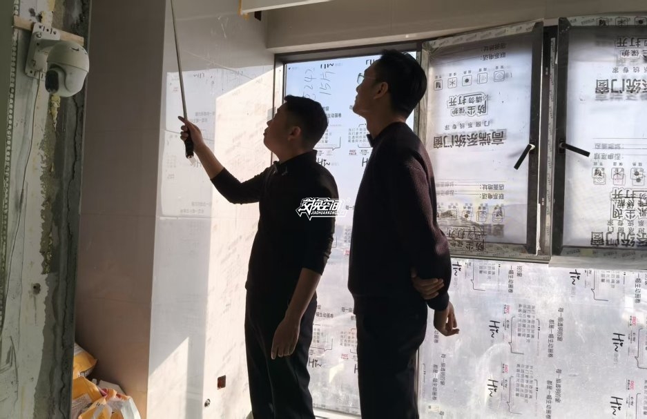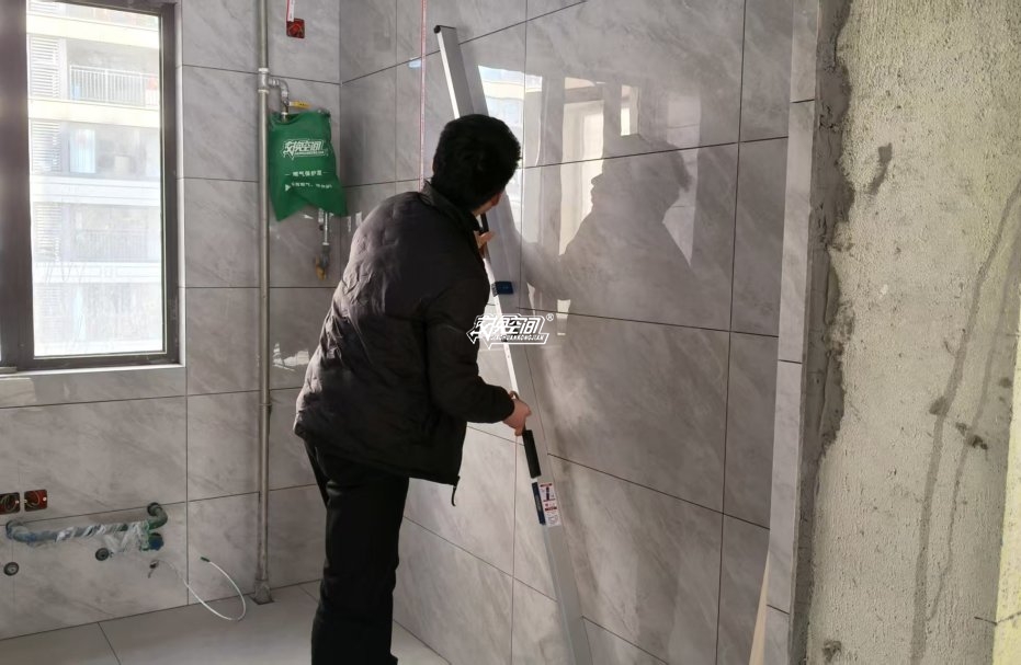 ▲检查地砖墙砖平整度。