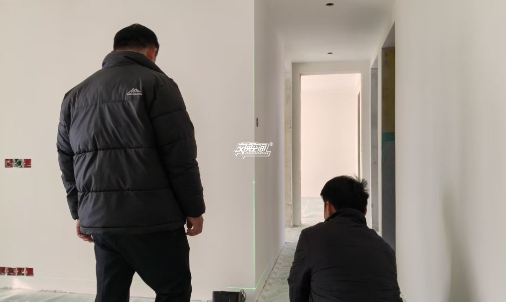 ▲用激光水平仪检查墙体阴角垂直度,如果激光线和角重合,则说明阴阳角垂直度没有问题;如果不重合,说明阴阳角不垂直。
