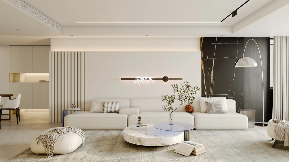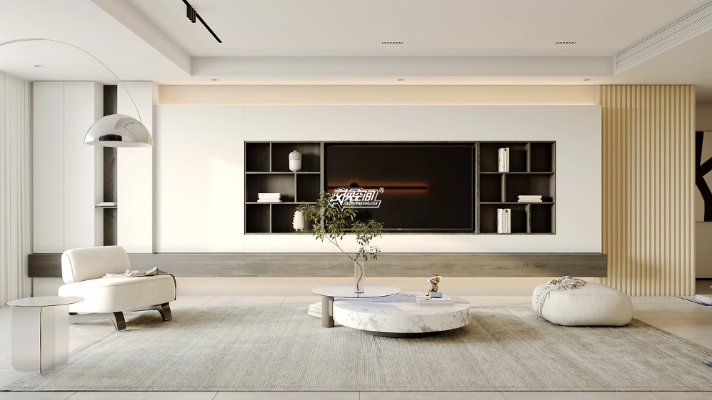 客厅的布局十分合理,弧形的白色沙发搭配几个简约的抱枕,时尚又温馨。旁边的弧形落地灯极具设计感,不仅实用还为空间增添了艺术气息。电视背景墙设计简约又实用,开放式的储物格可以摆放书籍和装饰品,美观与收纳功能兼具。圆形的大理石茶几精致又时尚,上面摆放的绿植为整个空间增添了生机与活力。
