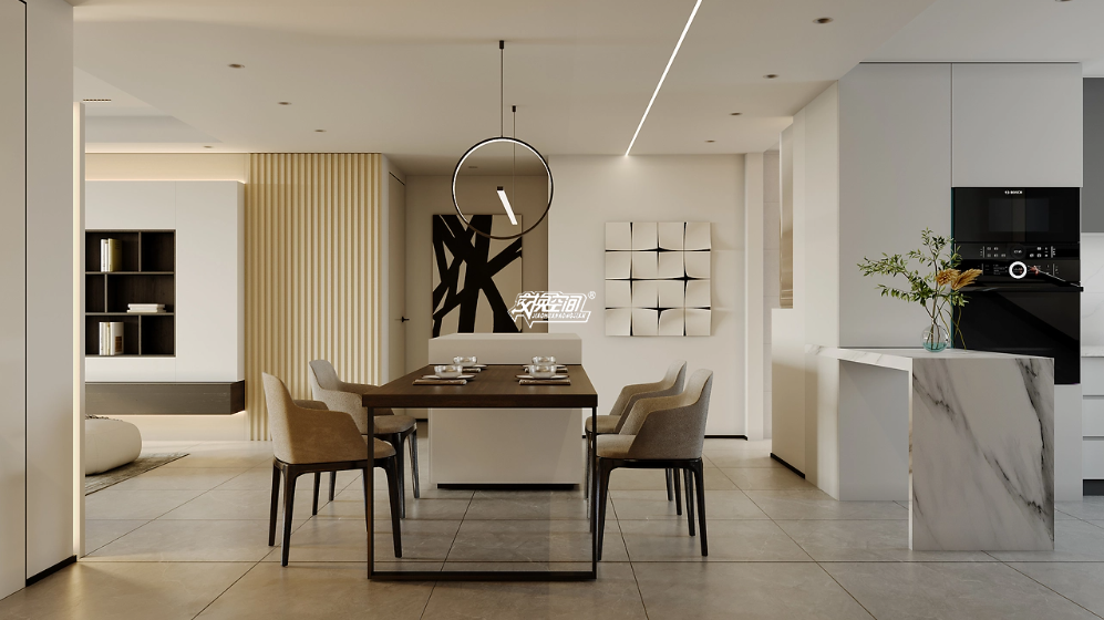 餐厅简洁又大气。整体色调以浅色系为主,白色的墙面搭配灰色的地面,营造出一种宁静、舒适的氛围。餐桌椅的选择十分考究,深木色的餐桌搭配浅灰色的座椅,简约却不失时尚感。餐桌上精致的餐具摆放整齐,仿佛在等待一场盛宴。
