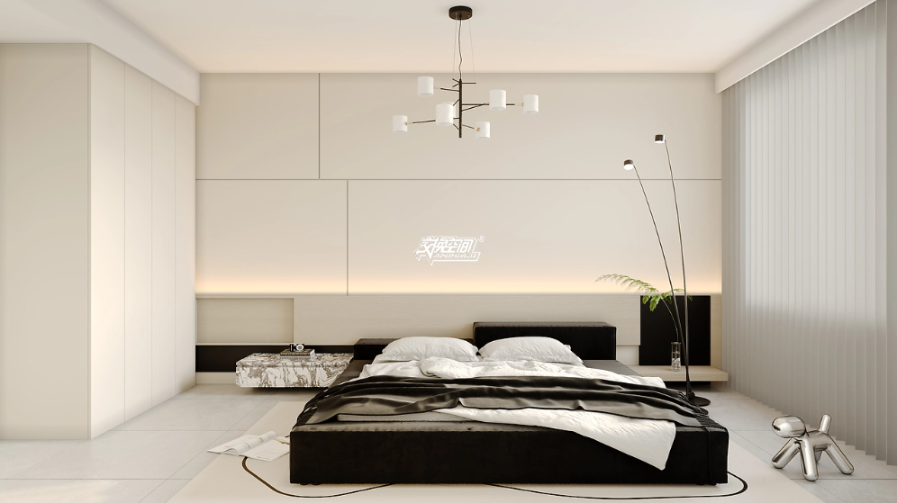次卧整体色调以米白色为主,搭配黑色的床具,形成鲜明的对比,简约又时尚。床头的吊灯设计感十足,多个灯头散发出柔和的光线,营造出温馨的氛围。
