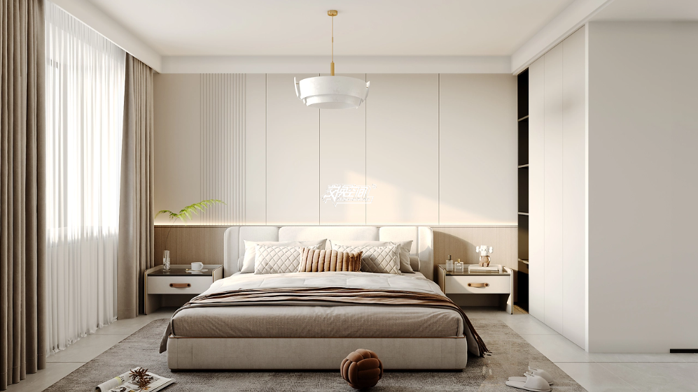 卧室整体色调以浅色系为主,白色的墙面搭配米色的床品,营造出一种宁静、柔和的氛围。床的设计简约却不失时尚感,搭配几个带有简单几何图案的抱枕,增添了一丝精致。床头两侧的小床头柜小巧实用,上面摆放着绿植和一些小物件,给空间带来了生机。
