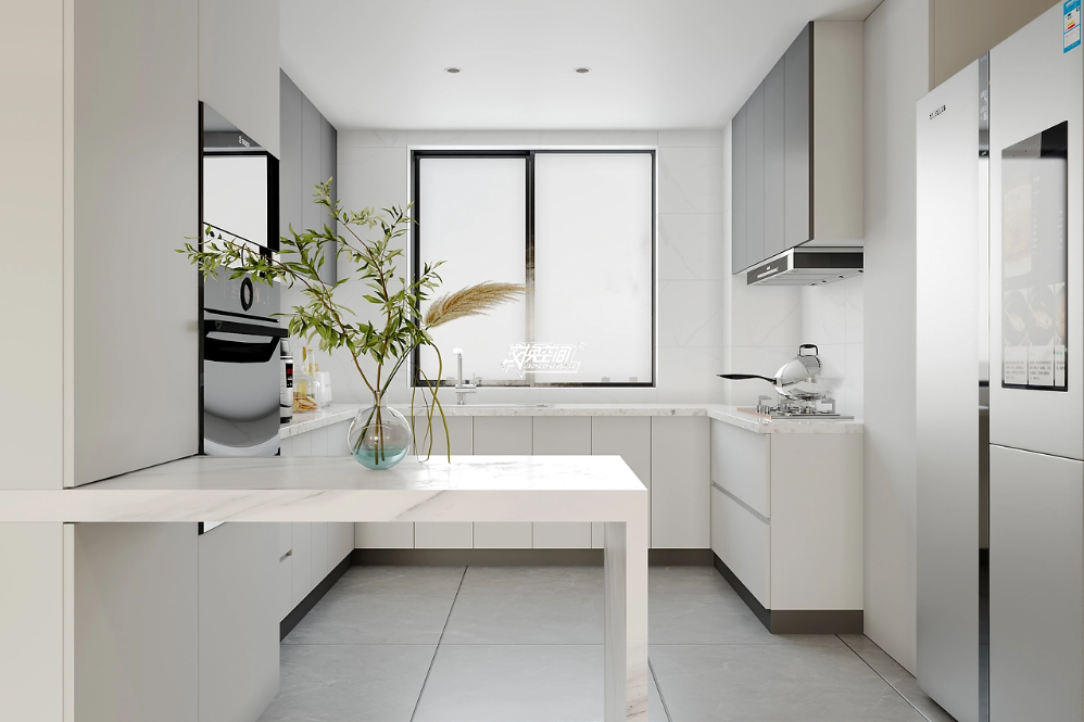 厨房整体以白色和浅灰色为主色调,给人一种干净、明亮又大气的感觉。白色的橱柜搭配浅灰色的地砖,简约却不失时尚感。橱柜设计简洁大方,有足够的空间来存放各种厨具和食材,让厨房保持整洁有序。